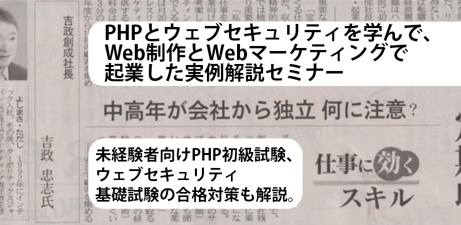 顧問の吉政忠志が「PHPとウェブセキュリティを学んで、Web制作とWebマーケティングで起業した実例解説セミナー」に登壇します。