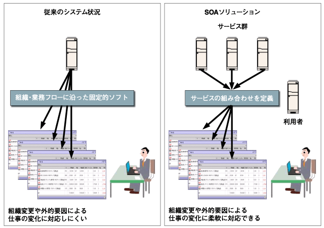 そんな状況を打開すべく、この世に生まれたのが「SOA:Service Oriented Architecture(サービス指向アーキテクチャ)」です。