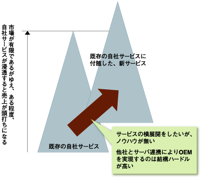 なぜ難しいかといいますと、現在ほとんどのASPはWebサービスをベースにしているため、新しい別カテゴリの付随サービスや新しいサービスを実現するために、大きな投資(ノウハウの獲得や、人材育成、システム開発も含めた投資)を行うか、他社とOEM契約を実現するしか方法がなく、いずれにせよ経営者にとってはなかなか勇気がいる判断になります。